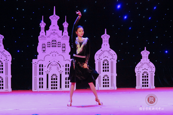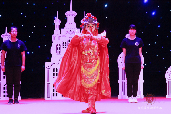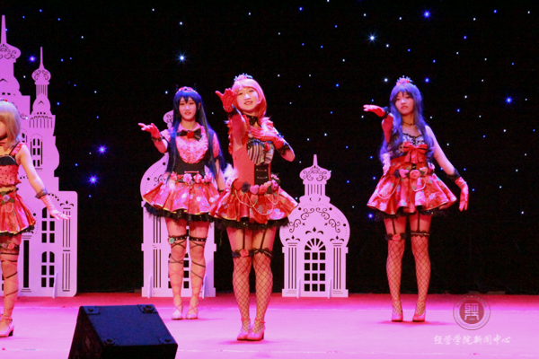 17级国贸班同学为大家带来的是小品《模特》。整个故事围绕着一个模特假人爱上一个绝症女孩展开,用欢快的氛围演绎了一个悲剧的故事,看完后笑中带泪。动漫社为大家带来的是宅舞《START DASH》。近十位萌妹子穿上了可爱的动漫服装,踩着动感的节拍,跳着欢快的舞步点燃了观众心中的火焰。场下的二次元爱好者甚至站起来跟着鼓点挥舞着荧光棒。一支舞蹈结束,观众还久久沉浸在欢乐的气氛中,精彩的节目一次次将迎新晚会推向高潮。