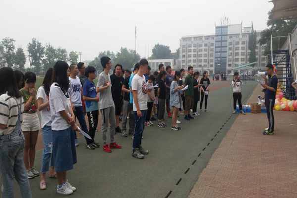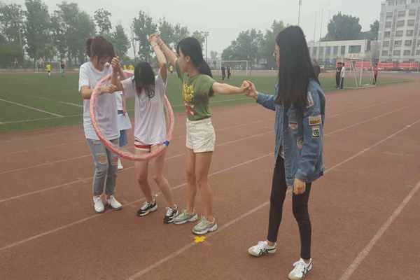 接着,又分别进行了默契大考验和男生女生向前冲的活动。前者意在考验默契,由睁眼的人指挥蒙眼的室友在规定地方取物;后者意在考验团队协作能力,通过接物、挤气球、看口型猜词、传递呼啦圈这四项接力赛来比较,时间最短者胜出。在这个环节中,同学们都参与其中,享受着游戏带给自己的快乐,操场上一片欢声笑语。