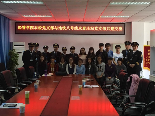 下午一时许,共建双方于经管楼401室召开座谈会,参与本次座谈会的有球王会副经理赵金芳老师、农经员工党支部书记刘笑冰老师、北京地铁运营三分公司永泰庄站区区长、站区书记、副站区长、其他工作人员及农经员工党支部部分党员与积极分子。