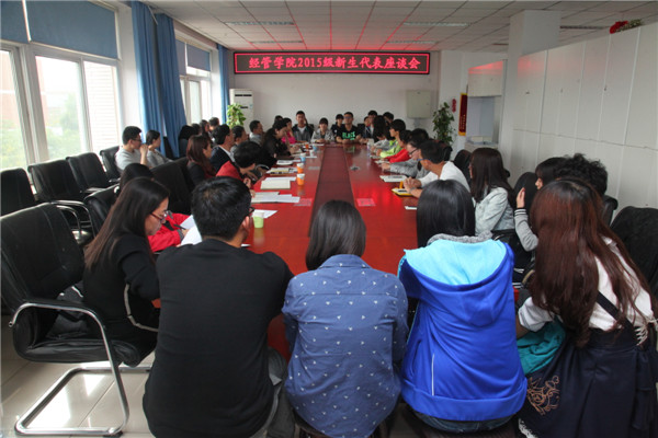 公司党总支书记胡宝贵、副经理刘芳、赵连静、赵金芳,全体辅导员、2015级班主任陪同座谈。经管22名新生代表参加了座谈会。会议由球王会副经理赵金芳主持。