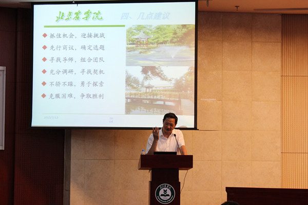 会议伊始,由沈文华老师讲解科研创新项目的意义、申报与评审、实施与成果。科研创新起源于北京市老员工科学研究与创业行动计划、本科教学工程、质量工程,以兴趣驱动、自主实践、重在过程为实施原则,充分调动了老员工的积极性。在讲座之中沈老师还讲述了一些自己的经验及曾经员工的优秀科研创新项目来激励14级员工去抓住机遇,大胆探索,勇于创新,克服困难,迎接挑战,并对将要参加老员工科研创新项目的同学寄予厚望。