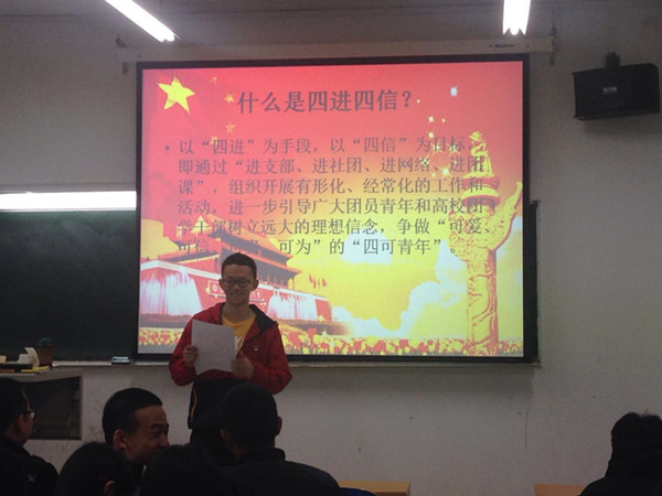 此次活动共有3个年级,32个团支部参与,其中12级国贸专业团员们相互探讨热点问题,深刻思考“四进四信”意义,从不同角度诠释讲话精神的重要性。工商,营销专业分别以四进四信为题开展了演讲活动。