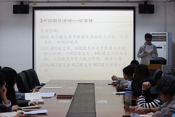 会议开始,文体委员任毅蒙首先总结了3月团日活动的完成情况,对成果优秀的团支部提出表扬,同时也对未能按时上交活动总结的支部提出批评。他针对校团委下发的四月团日活动文件,为到场支书宣读“四进四信”材料内容,传达文件精神,并对本月团日活动主题、内容及开展形式作出具体要求。