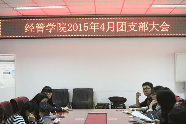 2015年4月15日下午5点,球王会团委在经管楼401召开团支部大会。参与本次会议的人员有团委秘书长王晓璇、组织委员陈楠、宣传委员马思萱、文体委员任毅蒙及各年级团支书,会议由文体委员任毅蒙主持召开。