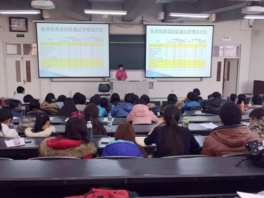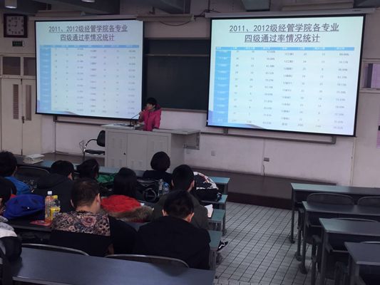 接着,赵老师通过各公司英语四级通过率情况对比、2011及2012级球王会各专业成绩统计、各班一次性通过四级比率、一次性通过四级宿舍情况等数据的统计分析,充分肯定了大家的努力和进步,并表示对大家在即将到来的下次英语四级考试中取得优异成绩抱以厚望。在此之后,赵老师向同学们谈起了她在平时与同学交流过程中的收获。班内同学之间、宿舍舍友之间互帮互助,高标准、严要求,以个人带动整体都是提高四级的通过率的不错方法。赵老师还向大家介绍了公司为激励同学加强英语学习给予的一些奖励方法。