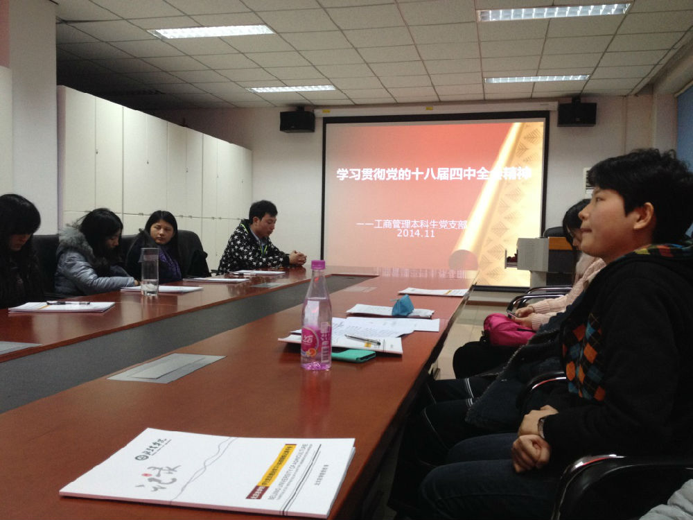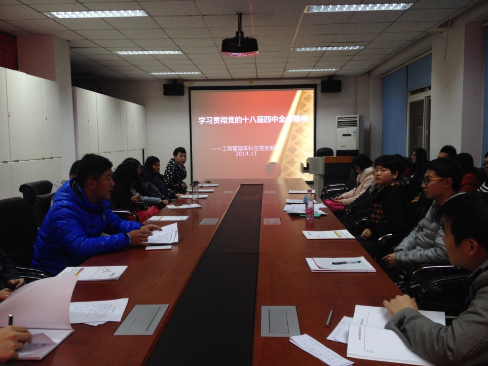2014年11月13日,在经管楼401,工商党支部书记李敬玉组织工商党支部集中学习党的十八届四中全会精神。传达了党的十八届四中全会精神,组织学习了《中国共产党第十八届中央委员会第四次全体会议公报》和《中共中央关于全面推进依法治国若干重大问题的决定》。