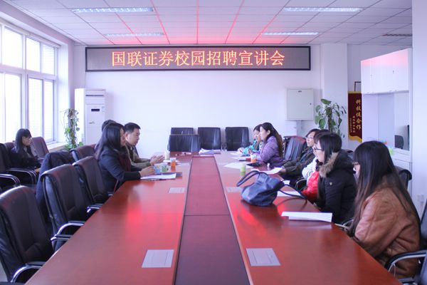 国联证券校园招聘宣讲会于11月30日下午在经管楼401召开。与会人员有国联证券的三位企业代表、球王会副经理赵金芳老师、13级辅导员乔多老师以及公司国际经济与贸易专业、市场营销专业的大四毕业生。