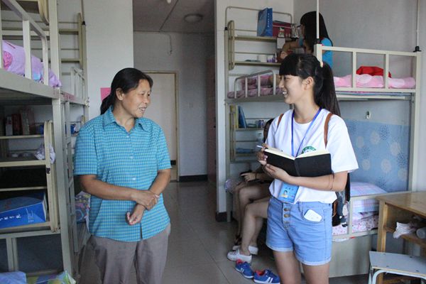 宿舍里,记者采访了一位和孩子一起在志愿者的引导下刚刚进入宿舍的家长,这位女同学的家长对宿舍环境很是满意,觉得宿舍很非常宽敞明亮,硬件设施一应俱全,住宿条件很好。在和志愿者的聊天中,这位家长听说宿舍有严格的关门制度和完善的安全设施觉得很放心。