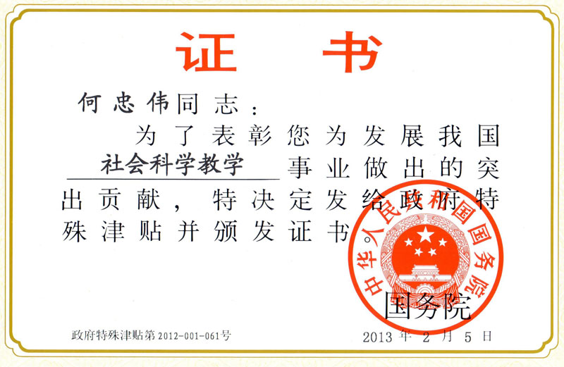 经国务院批准,按照《人力资源社会保障部关于公布2012年享受政府特殊津贴人员名单的通知》(人社部函[2013]31号)精神,球王会何忠伟教授被批准享受2012年政府特殊津贴。