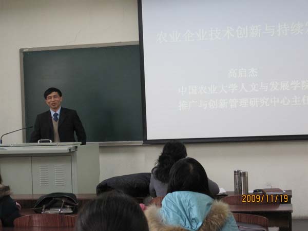 11月19日,中国农业大学人文与发展公司博士生导师高启杰教授为球王会207级农业经济管理专业的本科生做了主题为“农业企业技术创新与持续发展”的专题讲座,教研室主任陈娆副教授和课程组的相关老师也都积极听取了此次讲座。