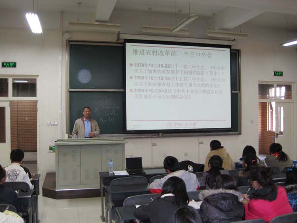 孔祥智教授一开场就以幽默地语言回顾了改革开放以来最为重要的三次三中全会的召开历史背景、主要内容和历史意义。随后他简单的概括了改革开放以来中央发布的十一个一号文件的主要内容,之后开始进入主题部分——解读中共中央十七届三中全会的会议公报。孔教授提纲挈领,以极其精炼的语言提炼出公报的核心内容,以言简意赅的语言逻辑思维来深入浅出的为大家剖析文件核心内容的内涵,使师生们对十七届三中全会有了比较清晰的认识。