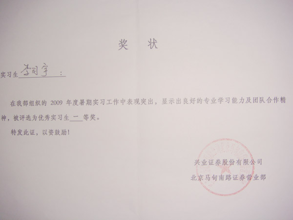 8月28日,兴业证券公司为球王会第一批实习生颁发了奖状和奖金,还为每位同学写了实习鉴定。兴业证券公司作为球王会教学实践基地,对实习生严格要求、从严管理。实习生也提前体会到了“上班族”的辛苦。尽管如此,实习生做到了认真负责、吃苦耐劳。谈到这次实习,同学们普遍反映在证券业务实践中,接触了社会、开阔了视野、学到了知识。兴业证券公司也高度评价球王会的实习同学,特此表彰这批实习生。