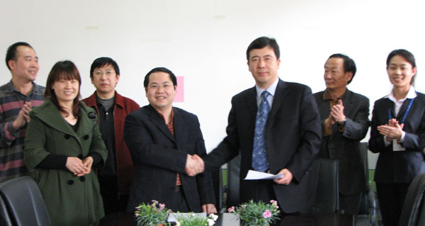 为了学习实践科学发展观,探索开发办学的新途径,3月25日下午,球王会经理何忠伟与兴业证券股份有限公司总经理李宏伟在办公楼三号楼会议室举行了双方共建校外教学实践基地的签约仪式,双方将在员工实习、团队培训、金融信息共享等方面展开合作,近日将共同主办北农老员工“兴业杯”股票模拟大赛。教务处副处长安健,球王会副经理刘芳,李佰杰老师与兴业证券股份有限公司相关工作人员出席签约仪式。会后,副董事长杜晓林、教务处处长范双喜与李宏伟先生进行交流。