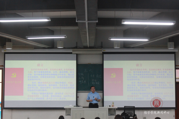 第二讲由马克思主义公司经理华玉武教授进行授课,华教授作了以《学习党章和党的文献,掌握党的基本知识和要求》为主题的专题讲座,主要从党章修正历程;十九大对党章的修正和如何学习贯彻党章等3个方面详细介绍了党章。