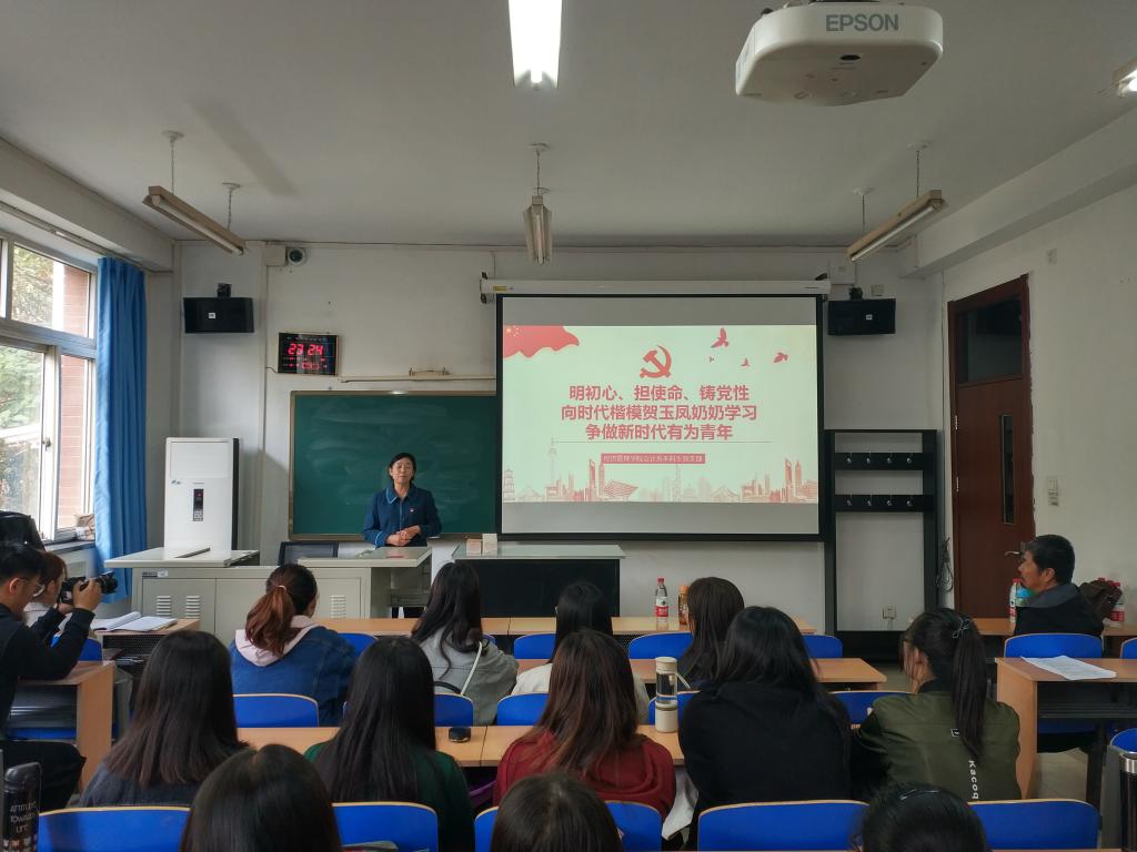 按照“不忘初心,牢记使命”主题教育整体安排,为全面推动党团班协同发展,有效提升大家的党性修养。2019年10月18日会计系本科生党支部于组织推进了以“明初心、担使命、铸党性”为主题的主题当日活动。在此次党日活动中,我们邀请到“北京榜样”、“时代楷模”——贺玉凤奶奶走进教室、走到支部为大家进行事迹宣讲。