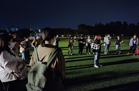 国贸专业新生开展“贴人”游戏。大家围成两个圈,里外两圈人数一样,外圈站在内圈人的身后,选两位同学作为抓人者和逃跑者,抓人者抓到逃跑者,两人身份互换,逃跑者若是跑到围成圈的队伍里,那么就由所在列的其他人担任逃跑者。游戏进行了很久,国贸2班的班长和班助还贴心的教了几个不会做游戏的人玩游戏。同学们彼此追逐着,欢笑着,徜徉在欢乐之中,青春之歌谱写在满是繁星的夜空中。