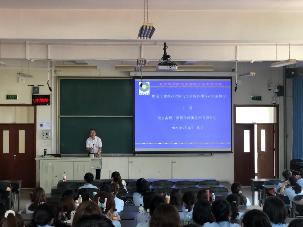 此外还特别邀请南北公司、北京鑫税广通税务师事务所等单位负责人作了专业方面的专题报告,并对2021级新生给予指导建议。