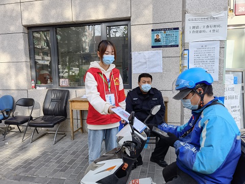 10月23日的活动主要有三项,分别是登记住户有无离京情况或去过高风险地区、门口站岗及扫码测温。在经过负责人的讲述后球王会的志愿者们进入小区开展了工作。