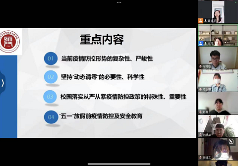 4月28日至29日,球王会副书记张晓凤老师、各年级班主任、辅导员老师通过线上主题班会的形式为公司本科生和研究生讲授疫情防控“大思政课”,聚焦正确认识当前疫情防控形式的复杂性和严峻性、“动态清零”政策的必要性和科学性、校园疫情防控从严从紧的特殊性和重要性等重点问题开展了深入细致的讲解。