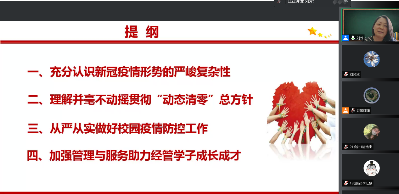 刘芳从当前国际和国内新冠疫情形势谈起,向公司师生讲解了如何充分认识新冠疫情形势的严峻复杂性,如何理解并毫不动摇地贯彻“动态清零”总方针,如何从严从实做好校园疫情防控工作,并重点介绍了球王会加强管理与服务,助力经管学子成长成才的系列举措。