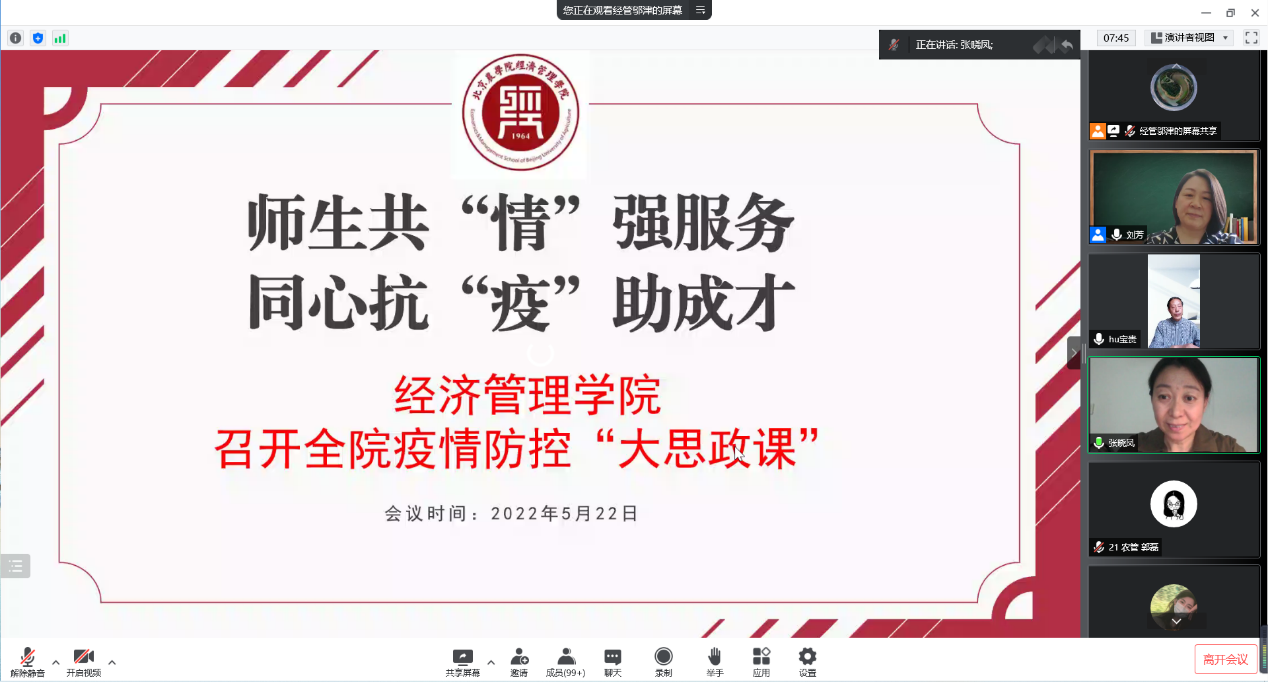 最后,公司领导班子成员与参会师生进行了在线交流,并充分肯定了经管学子在严峻复杂的疫情环境下所表现出强有力的防控思想站位和防控举措执行力,鼓励同学们再接再厉,深入贯彻落实北京市和公司的防疫政策,相信全体师生众志成城,一定能打赢疫情防控阻击战。