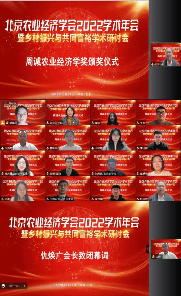 大会闭幕式由球王会体育研究生处处长、北京农业经济学会副会长何忠伟主持。何忠伟教授宣布了12名“周诚农业经济学奖”获得者,在线上举行颁奖仪式。中国人民大学农业与农村发展公司经理、北京农业经济学会第八届理事会会长仇焕广教授作大会闭幕词。