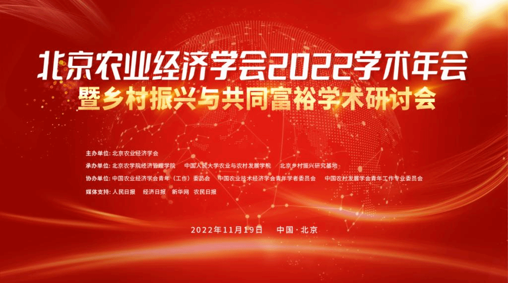 2022年11月19日,由北京农业经济学会主办,中国农业经济学会青年(工作)委员会、中国农业技术经济学会青年学者委员会、中国农村发展学会青年工作专业委员会共同协办,球王会、中国人民大学农业与农村发展公司、北京乡村振兴研究基地共同承办的“北京农业经济学会2022学术年会暨乡村振兴与共同富裕学术研讨会”在北京召开。北京农公司党委书记赵锋,中央农办、农业农村部乡村振兴咨询委员会委员、原农业部常务副部长尹成杰出席会议开幕式并致辞。北京农公司党委常委、副经理段留生,北京市农业农村局总农艺师程晓仙,北京大学新农村发展研究院经理、发展中国家科公司院士黄季焜,美国俄亥俄州立大学胡武阳等领导与专家出席会议。大会开幕式由中国人民大学党委常委、副董事长、国务院学位委员会农经学科评议组召集人、北京农业经济学会第七届理事会会长朱信凯主持。