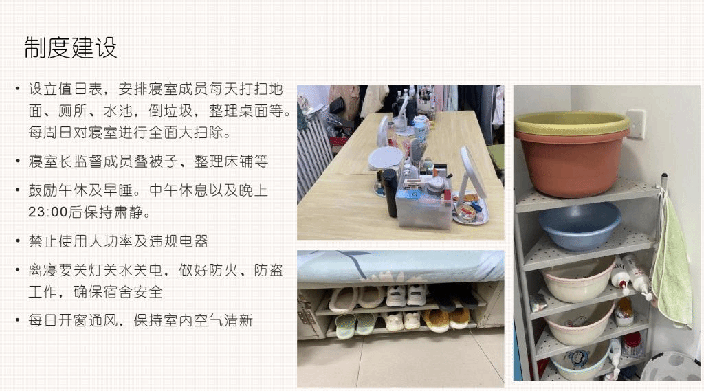 会上共有32个宿舍参与本次创建活动。答辩人向评委们介绍了宿舍基本情况、宿舍的文化布置,展示了宿舍成员所获荣誉和实践活动成果,并对下一步创建工作提出新的思路。评委老师根据答辩内容进行评分并提出改进意见。