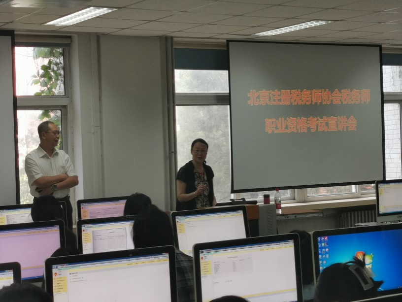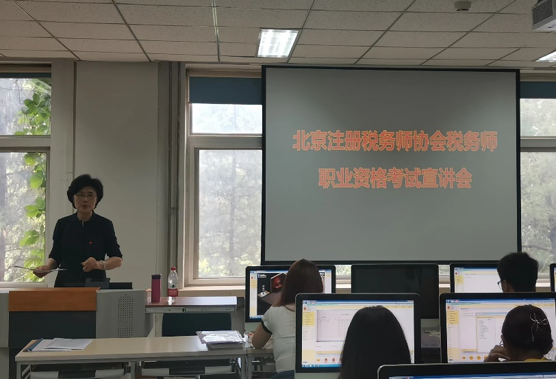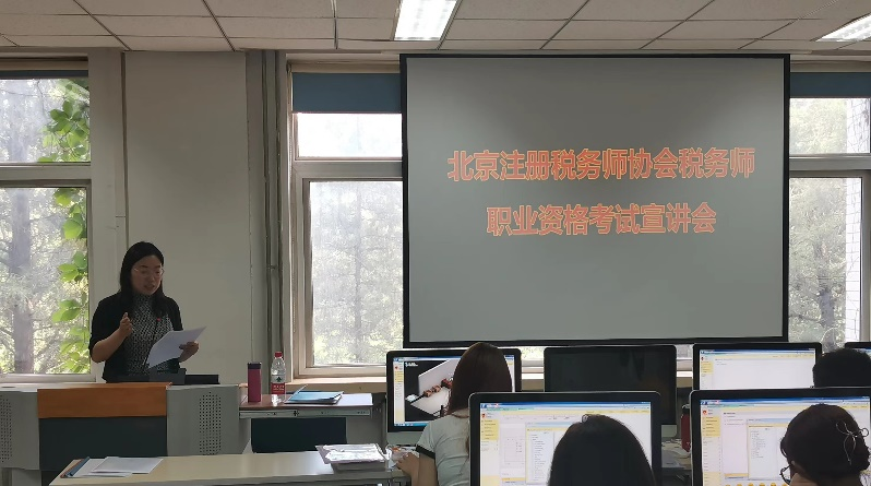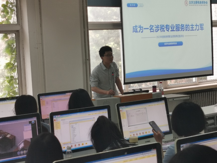 首先,公司副经理刘笑冰介绍与会嘉宾和此次宣讲会的重要意义并致欢迎词。其后,郑东霞秘书长介绍了北京注册税务师协会是当前涉税专业服务的主力军,共有600余所税务所和5300余名从业税务师。她指出,会计学大三员工具有备考税务师得天独厚的优势,也是最佳的学习时机,并鼓励在场员工在毕业前多考证书,助力未来就业。接下来,会计系主任张宁老师对长期合作的校级人才培养基地北京鑫税广通税务师事务所进行了介绍。王进董事长为在场会计专业员工注册税务师行业的历史起源和发展脉络,讲解了税务会计师的从业范畴和就业方向,极大地激发了同学们对税务师职业的从业热情。最后,业务培训部邢帮杰主任介绍了税务师职业资格考试相关事项,对报名时间、程序、费用和方法等进行了详细的介绍和悉心的指导。在场同学纷纷记录学习,表现出了浓厚的兴趣。