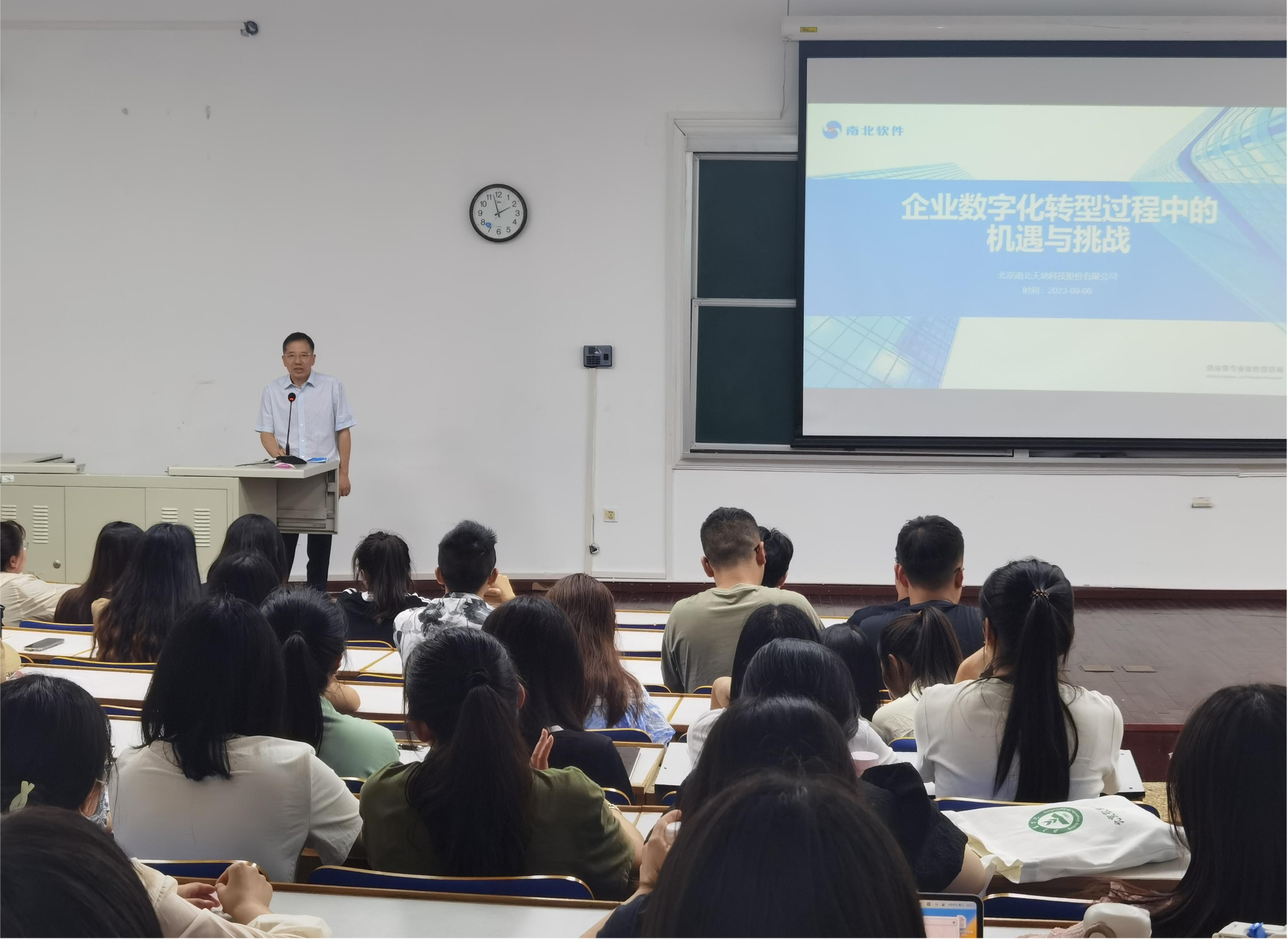 在《静观论坛》第89期《企业数字化转型过程中的机遇与挑战》讲座上,彭易清董事长以北京南北天地科技股份有限公司为例,阐述了什么是企业数字化转型、数字化转型为企业带来的价值,并结合企业数字化转型后的用人需求,提出“要实践、有技能、会表达、会计划”的建议,为员工未来的努力方向提出建议。